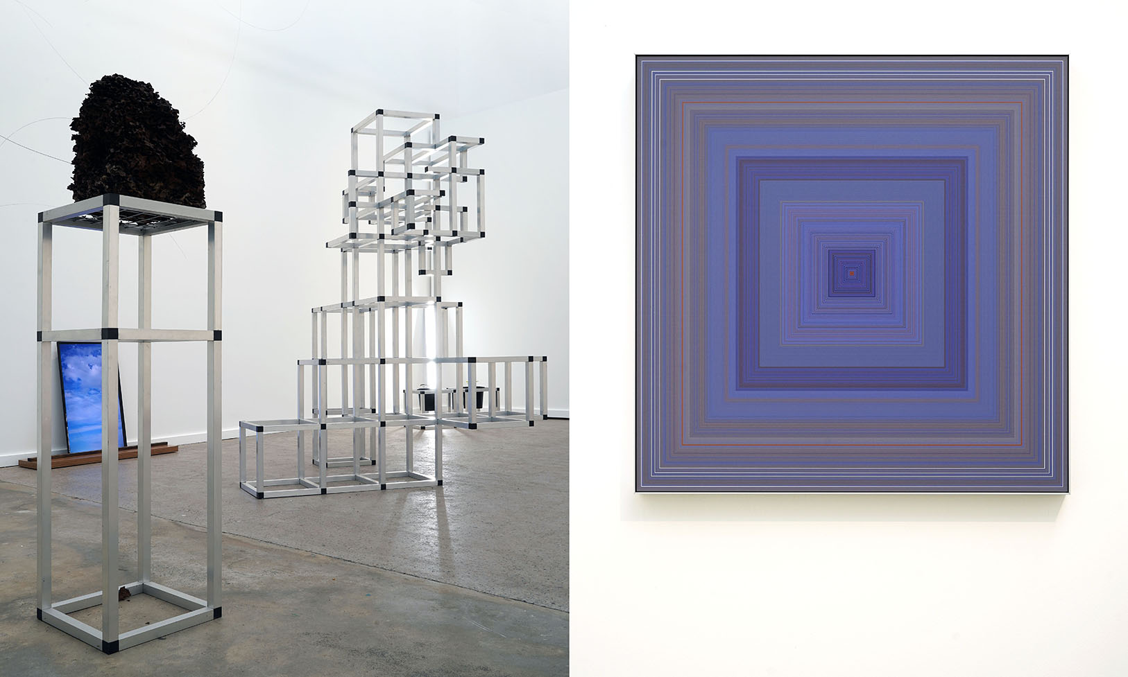 ACUMINATA consists of an eclectic mix of man-made and natural objects. Many come from my home on Garigal country north of Sydney. An arboreal termite nest that fell from a casuarina near the boundary fence, two potted plants grown from seed, a video of bees swarming from their hive under the house, an image composed of sky colours recorded at 7am each morning, an unclad structure I made from short lengths of aluminium. For me, this work captures something of the ecosystems of which I am part and how they are expressed in material forms that build up incrementally over time.